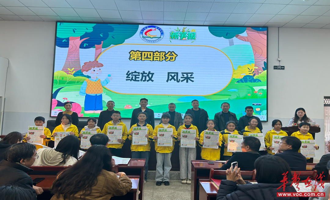 “綻放·風(fēng)采”互動(dòng)環(huán)節(jié)亮點(diǎn)十足,三期報(bào)紙的小作者、小畫(huà)家、手抄報(bào)獲獎(jiǎng)代表及親子閱讀家長(zhǎng)代表依次登臺(tái),手持報(bào)紙與校領(lǐng)導(dǎo)合影,大屏同步展示報(bào)紙核心版面,盡顯少年創(chuàng)作活力。